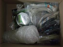 왼쪽부터 리모콘, 건전지, 메뉴얼, 스트레오 케이블, D-Sub케이블, AC케이블, 어댑터.